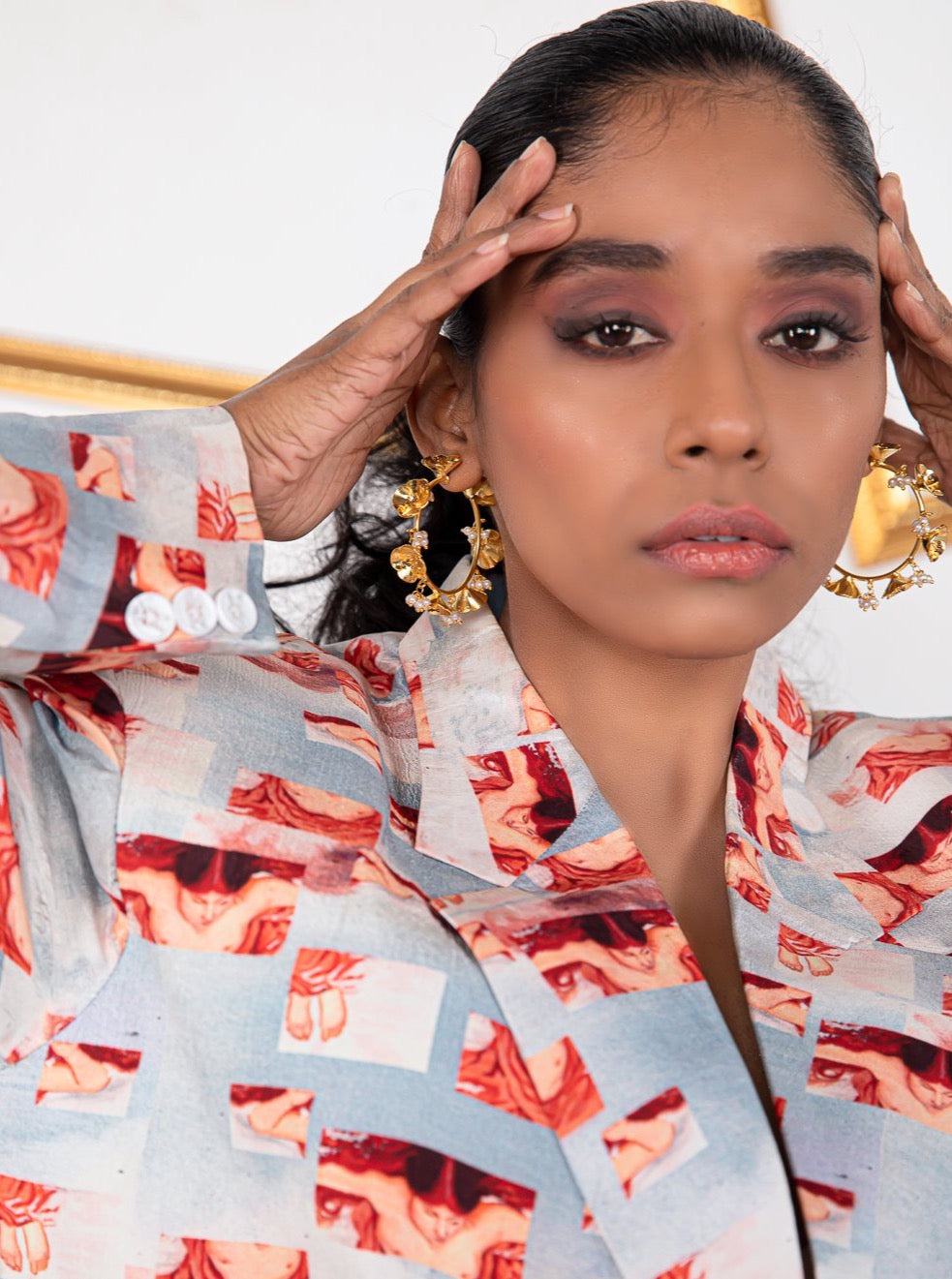 The print on this suit is indicative of the assassination of Julius Caesar, former Roman general and statesman. It signifies triumph over the romanticized notions of subjugation.