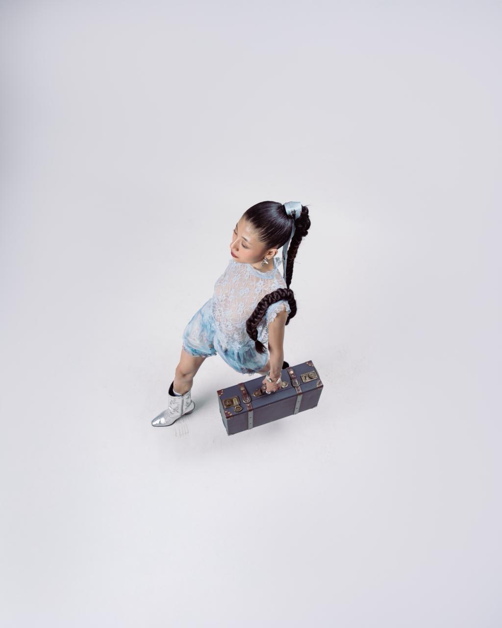 The blouse is a powder blue lace — gauzy, translucent, and light as a sigh. It doesn’t hold shape so much as suggest it. It drapes at the collarbone like something remembered — not worn. The kind of fabric that doesn’t welcome metal, only skin.
